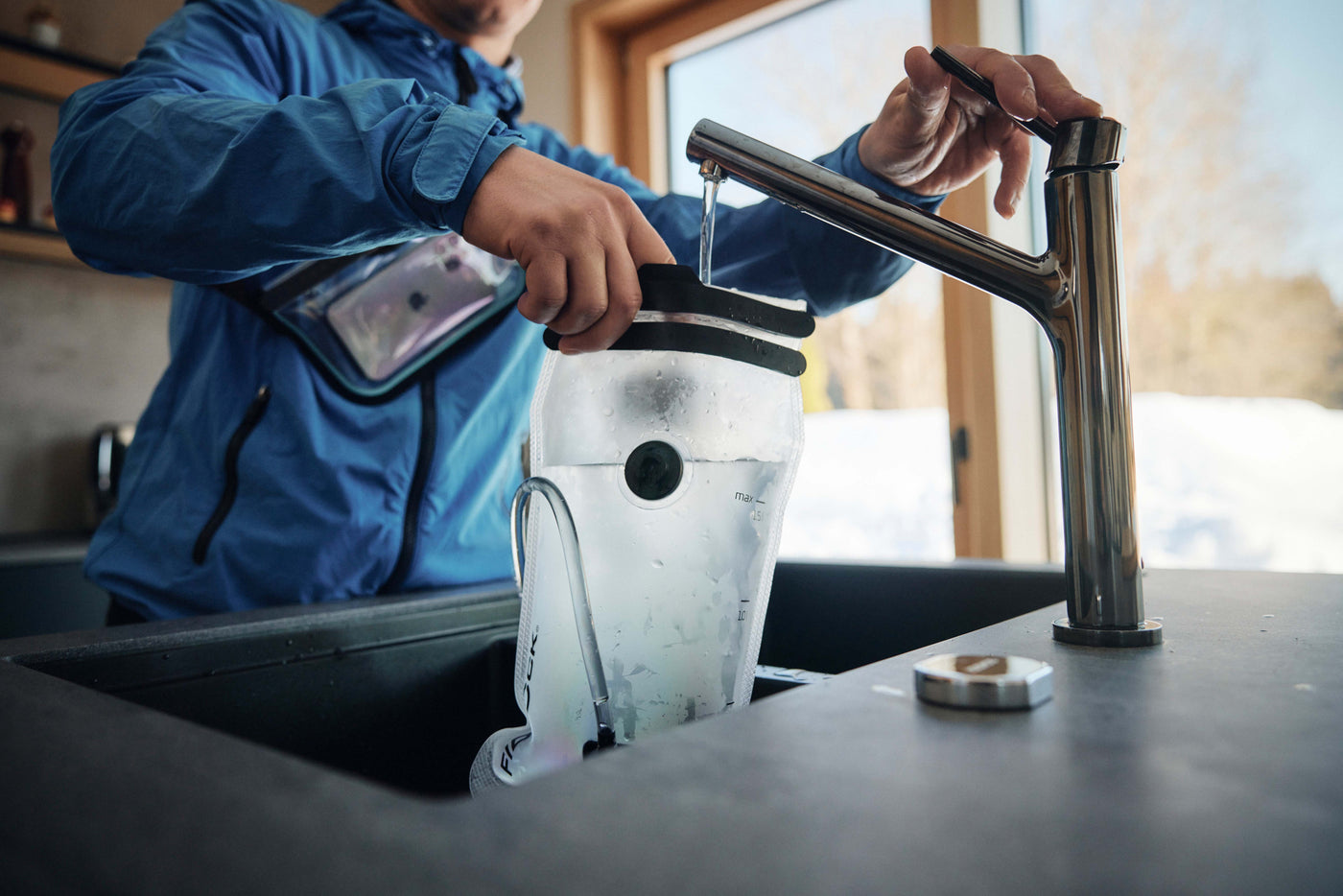 ‘Just let go!’ Quick one-handed operation: Fill water in your bladders and let the three rows of magnets snap shut by themselves.