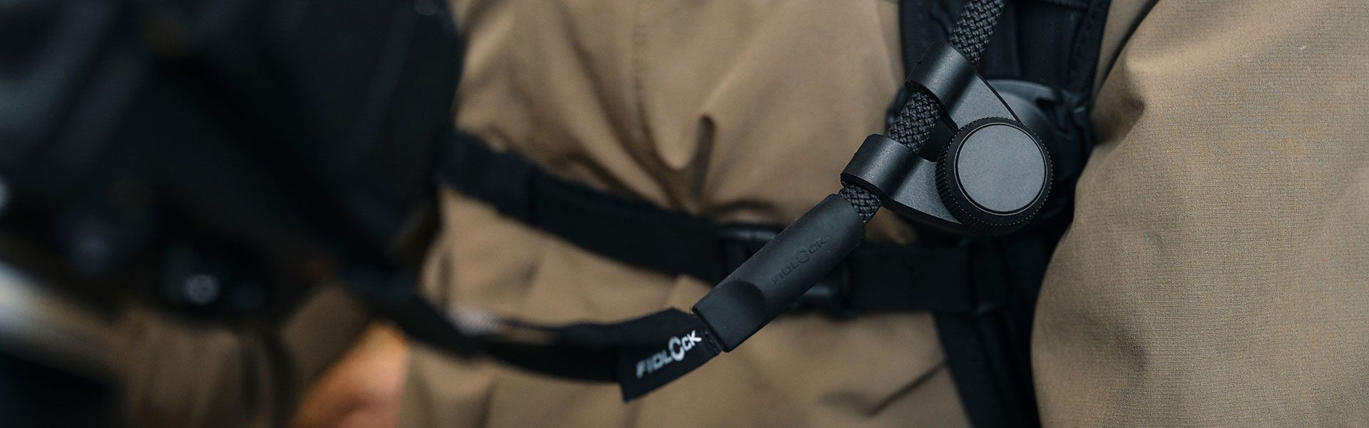 Based on a patented system, the magnetic-mechanical mount is attached to the shoulder strap of a backpack.
