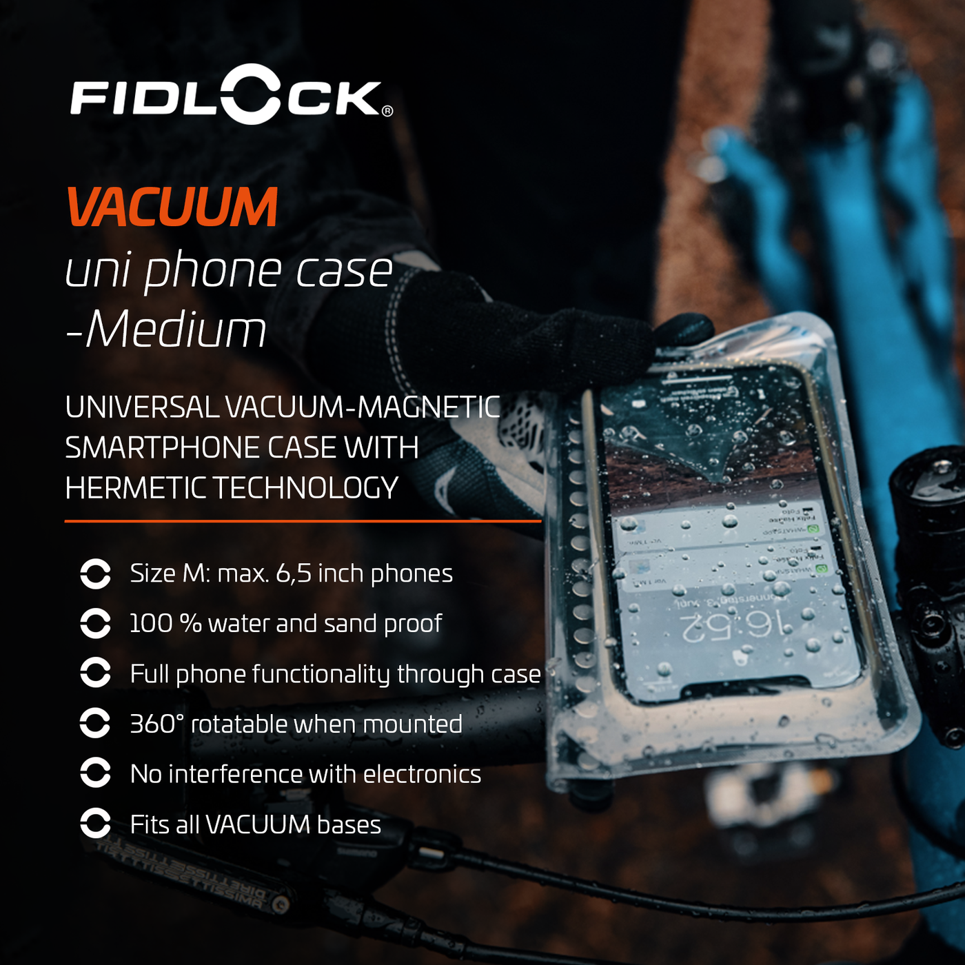 Thanks to the patented "just-let-go principle,” the case closes automatically and is fully-hermetic. No manual locking, clicking or pushing. Once snapped onto the VACUUM base, the smartphone is safely protected even on muddy trails.