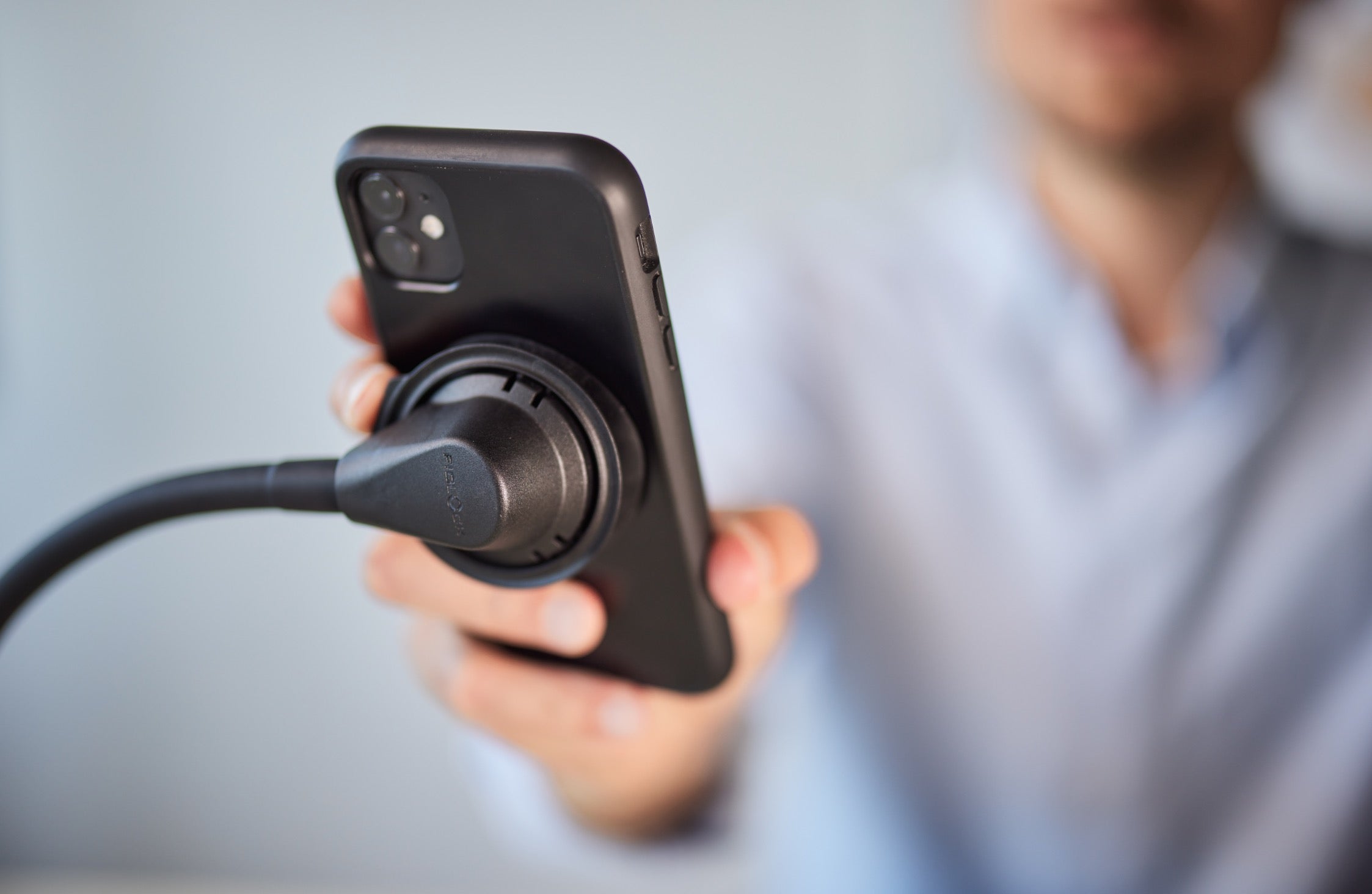 Comme tous les autres produits VACUUM, la base de bureau VACUUM flex est facile à utiliser d'une seule main : pour fixer le smartphone à la base, il suffit de le tenir brièvement devant la base. La force magnétique est immédiatement perceptible : la base et la tête VACUUM se rapprochent. La force magnétique centre le téléphone sur la base et, combinée au vide, assure une tenue ultra forte. Pour retirer le téléphone, appuyez simplement sur le levier de commande situé à l'arrière de la base pour libérer le VIDE.